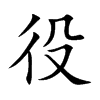 (古文作役。会意。甲骨文字形,像人持殳击人。本义:服兵役,戍守边疆)