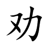 (形聲。從力,雚聲。簡化字中「又」僅是一個符號。本義:勉勵)